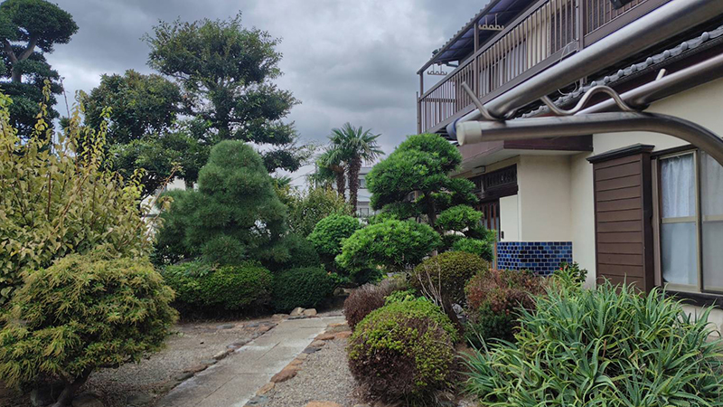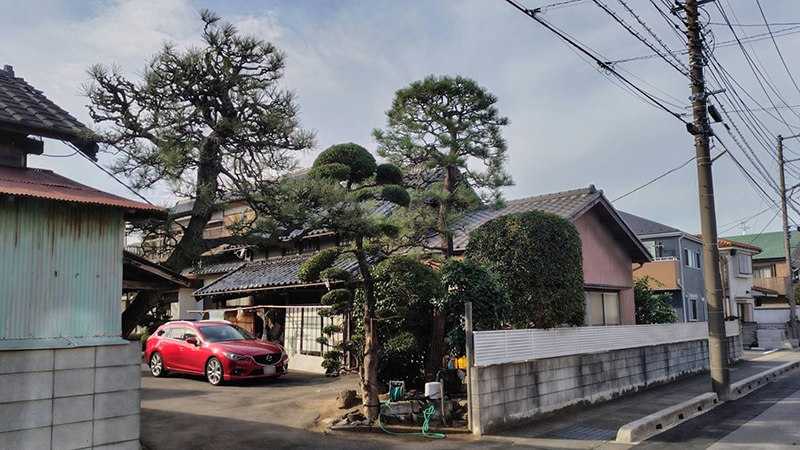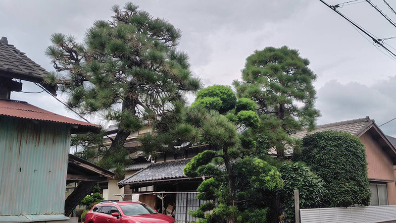 このお庭の最大の見どころは、門の両脇にそびえる立派な松の木です。この松は、亡きご主人が何十年もかけて整え、大切に育ててこられたもので、形状の美しさと迫力は近所でも一目置かれる存在です。